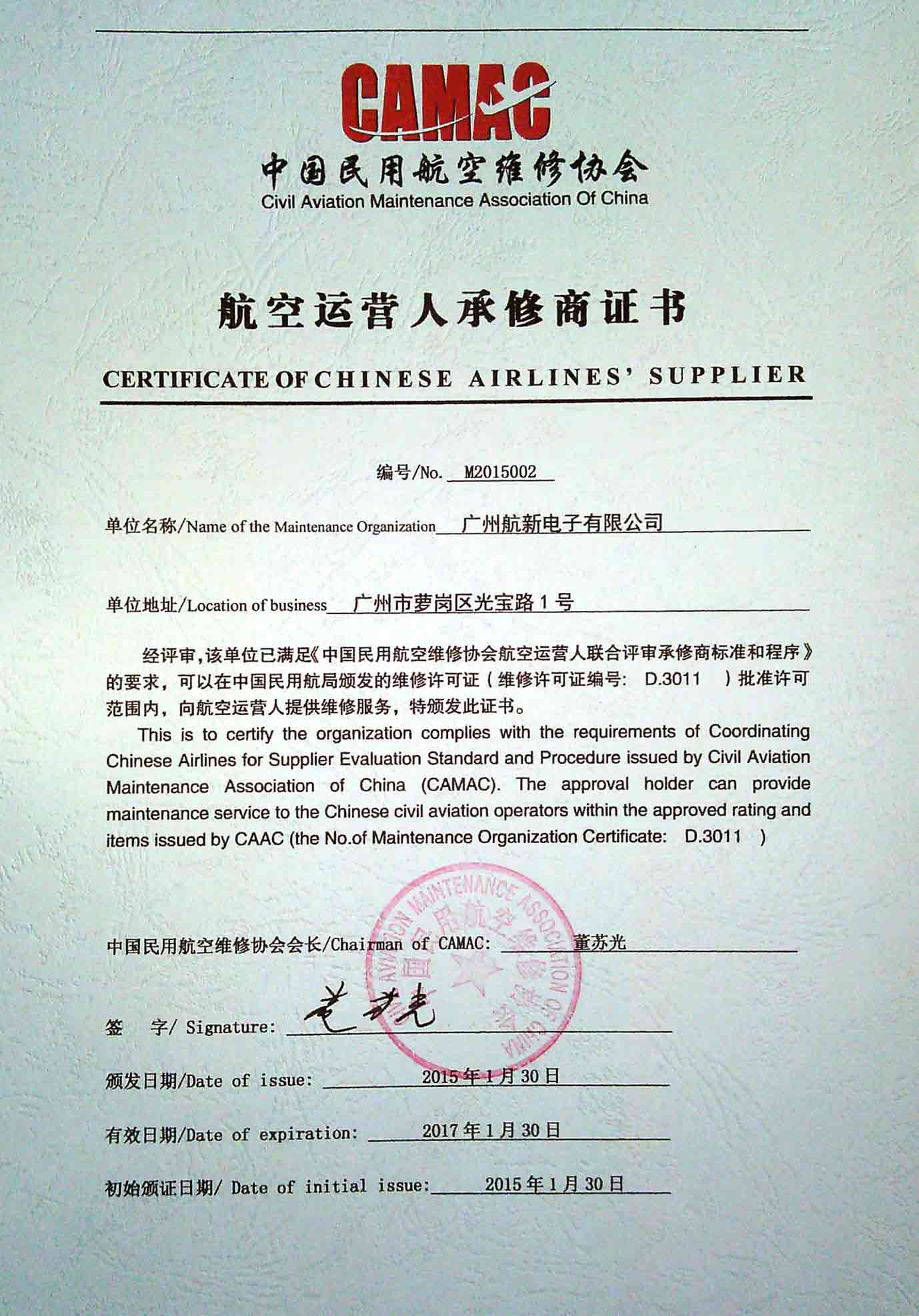 Certificate of Chinese Ai...
